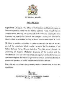 “The commander of the Malawi Defence Forces, General Valerio Phiri, has since informed His Excellency, Dr Lazarus McCarthy Chakwera, of the incident and the president has since cancelled his scheduled departure for the Bahamas and ordered all regional and national agencies to conduct an immediate search and rescue operation to locate the whereabouts of the aircraft (sic).”