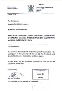 In the June 5, 2024 letter to the rural council’s chairperson, Mary Mliswa-Chikoka, Mohadi’s says it was President Mnangagwa who ordered that the sprawling piece of land be handed over to WHI-ZIM Construction Material Investments (Pvt) Ltd, a Chinese company.